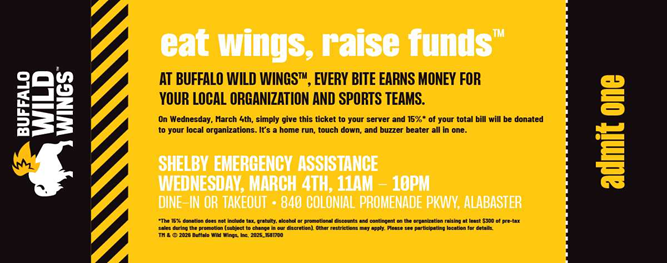 Join us for a Spirit Night at Buffalo Wild Wings in Alabaster and help support Shelby Emergency Assistance all while enjoying your favorite wings, fries, and sports vibes.